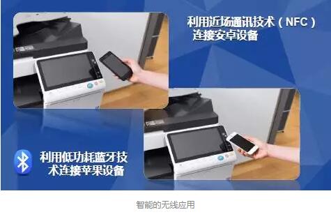 “它”采用全新的9英寸电子式触摸屏,配备现今最为先进的智能终端触控区:安卓系统设备可通过NFC技术与复合机连接;IOS系统设备可通过低功耗蓝牙技术与复合机连接,用户只需让移动设备触碰触控区,便可实现即时的匹配。不仅如此,苹果设备用户通过Apple AirPrint即可轻松连接,进行打印、扫描和传真的操作。同时,“它”可在支持Mopria Print Service 应用程序的Android 设备上进行无线打印。