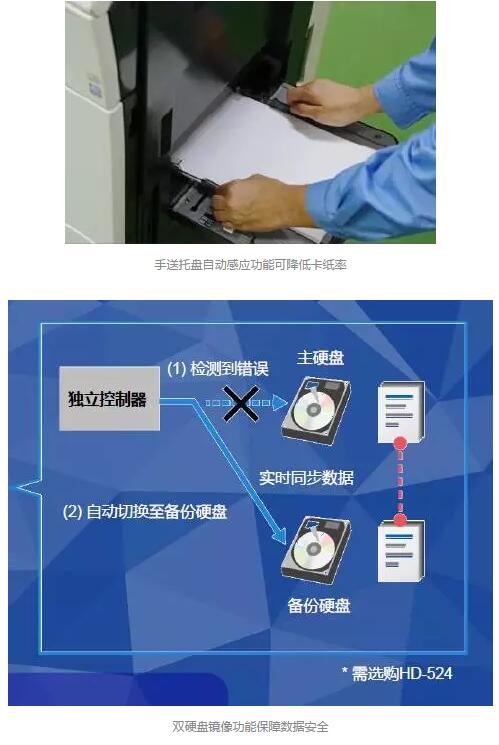 “它”配备了手送托盘自动感应功能,可有效避免手送托盘卡纸的发生;双硬盘镜像功能帮助实现数据实时同步,降低了数据丢失的风险;故障记录自动收集和远程搜索设备故障记录功能,有助于减少停机时间……种种精心考量的人性化设计,充分满足了用户高便捷性打印的需求。